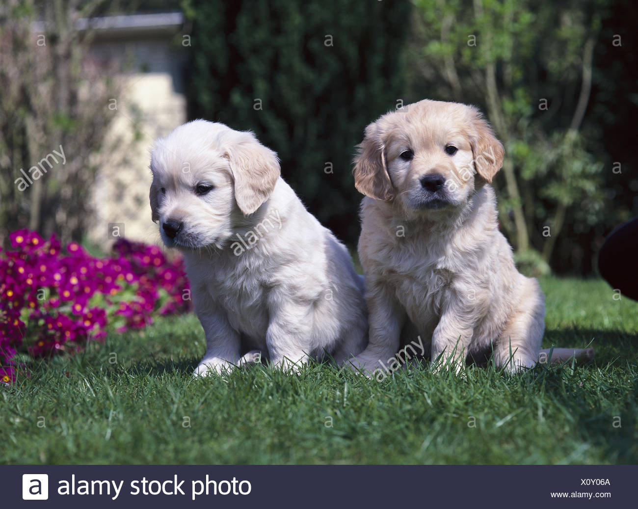 Garten Golden Retriever Welpen Zwei Sit Garten Tiere Saugetiere Haustiere Hunderasse Rassehunde Hund Familienhunde Begleitende Hunde Jagdhunde Blindenhunde Jung Klein Junge Junge Tiere Jungtiere Weiss Sommer Draussen Streicheln