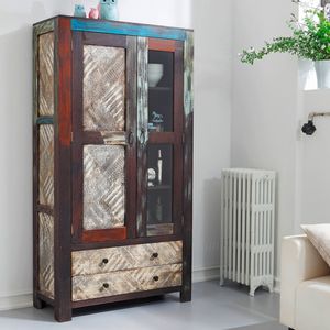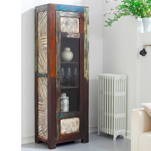 Wolf Möbel Himalaya Vitrine old recycled wood mehrfarbig 50x180x40cm. Die gradlinigen Massivmöbel verzichten auf überflüssige Details und strahlen Ruhe und Harmonie aus. YOGA Vitrine mit 1 Glas- 2 Holztüren 3 Schubladen Artikel Nummer 6400.