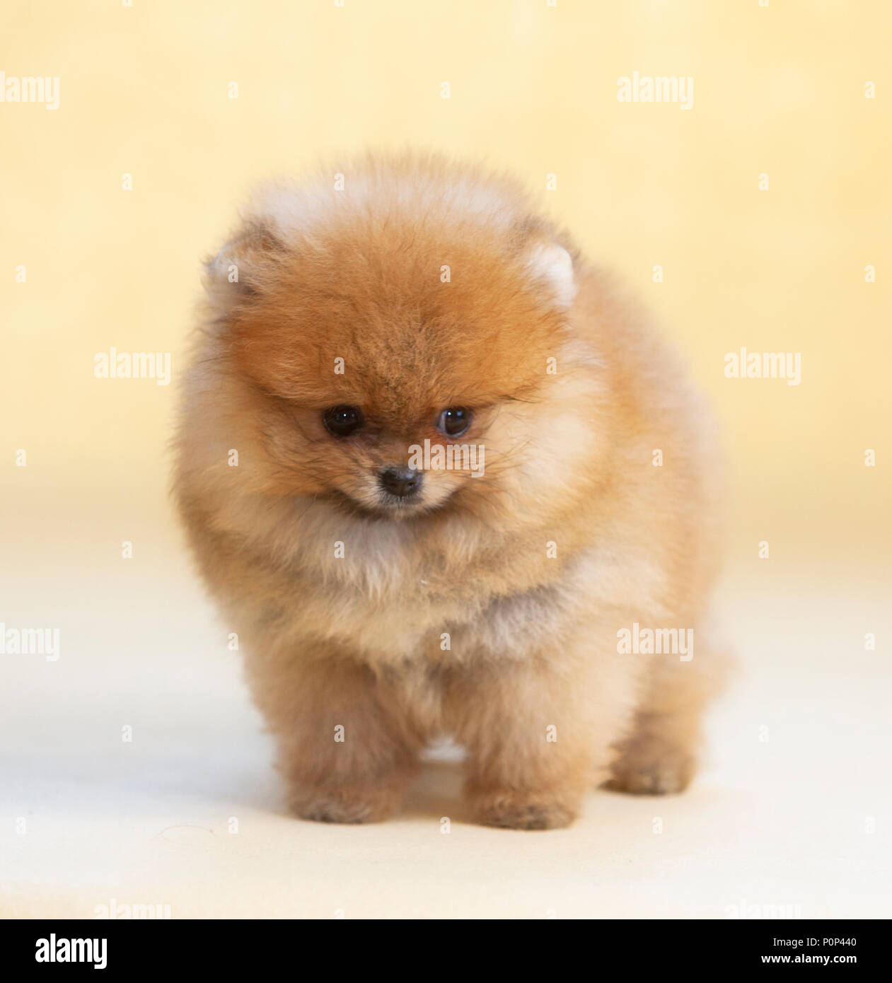 Pomeranian Welpen Hund Portrait Im Studio Mit Hellgelben Hintergrund Stockfotografie Alamy