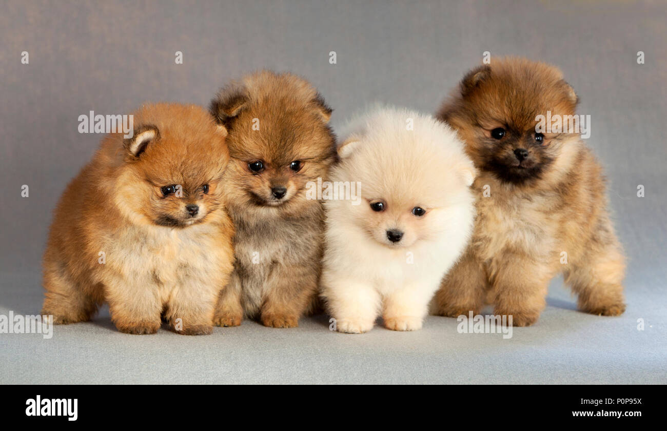 Vier Pomeranian Welpen Hund Portrait Im Studio Mit Hellgrauem Hintergrund Stockfotografie Alamy