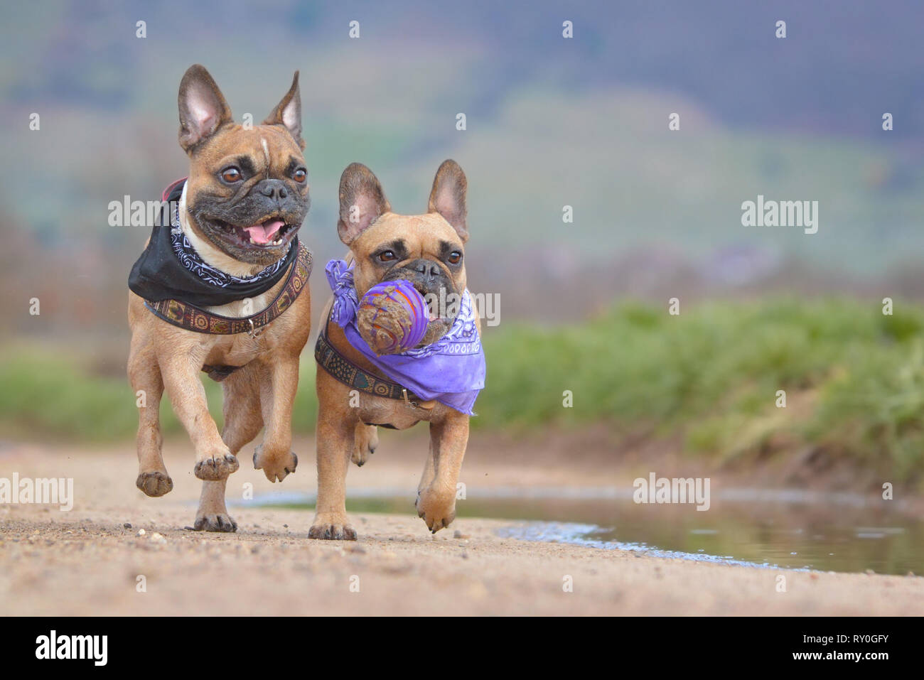 Aktion Schuss Von Zwei Fawn Franzosische Bulldogge Hunde Halstuch Tragen Gemeinsam In Richtung Kamera Mit Ball Spielzeug In Die Schnauze Stockfotografie Alamy