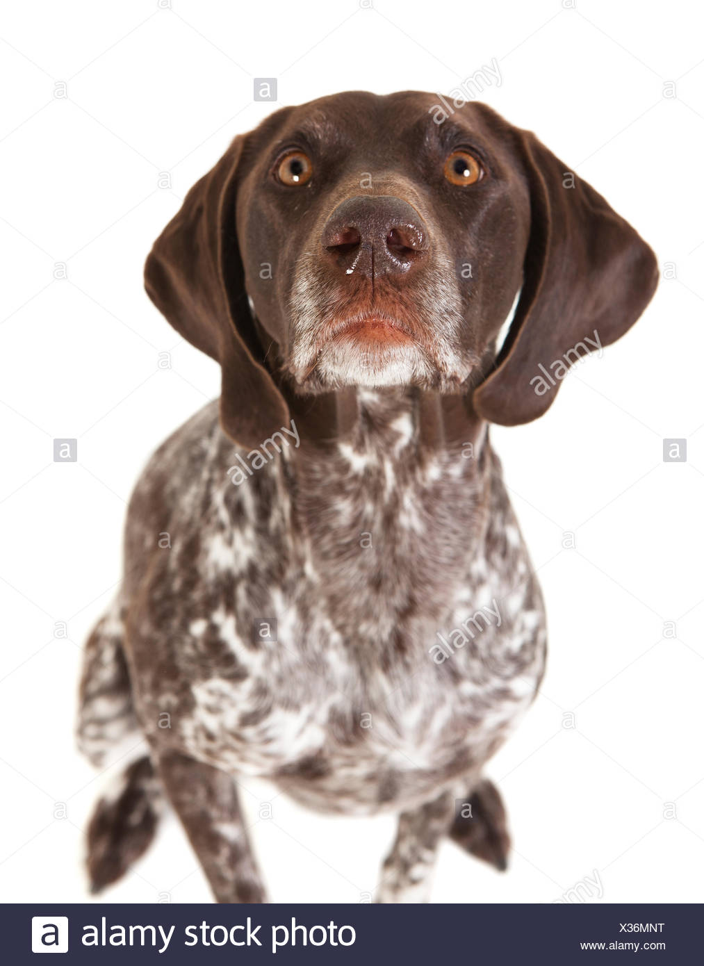 Ein Jagdhund Der Rasse Deutsch Kurzhaar Sitzend Vor Weissem Hintergrund Stock Photo Alamy