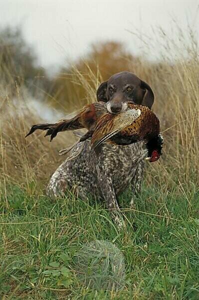 Bildagentur Mauritius Images Wiese Jagdhund Deutsch Kurzhaar Maul Jagdbeute Fasan Tiere Saugetier Saugetiere Haustiere Haustier Canidae Hunde Hund Jagdhunde Vorstehhund Sitzen Wildtiere Wildtier Beute Fang Stolz
